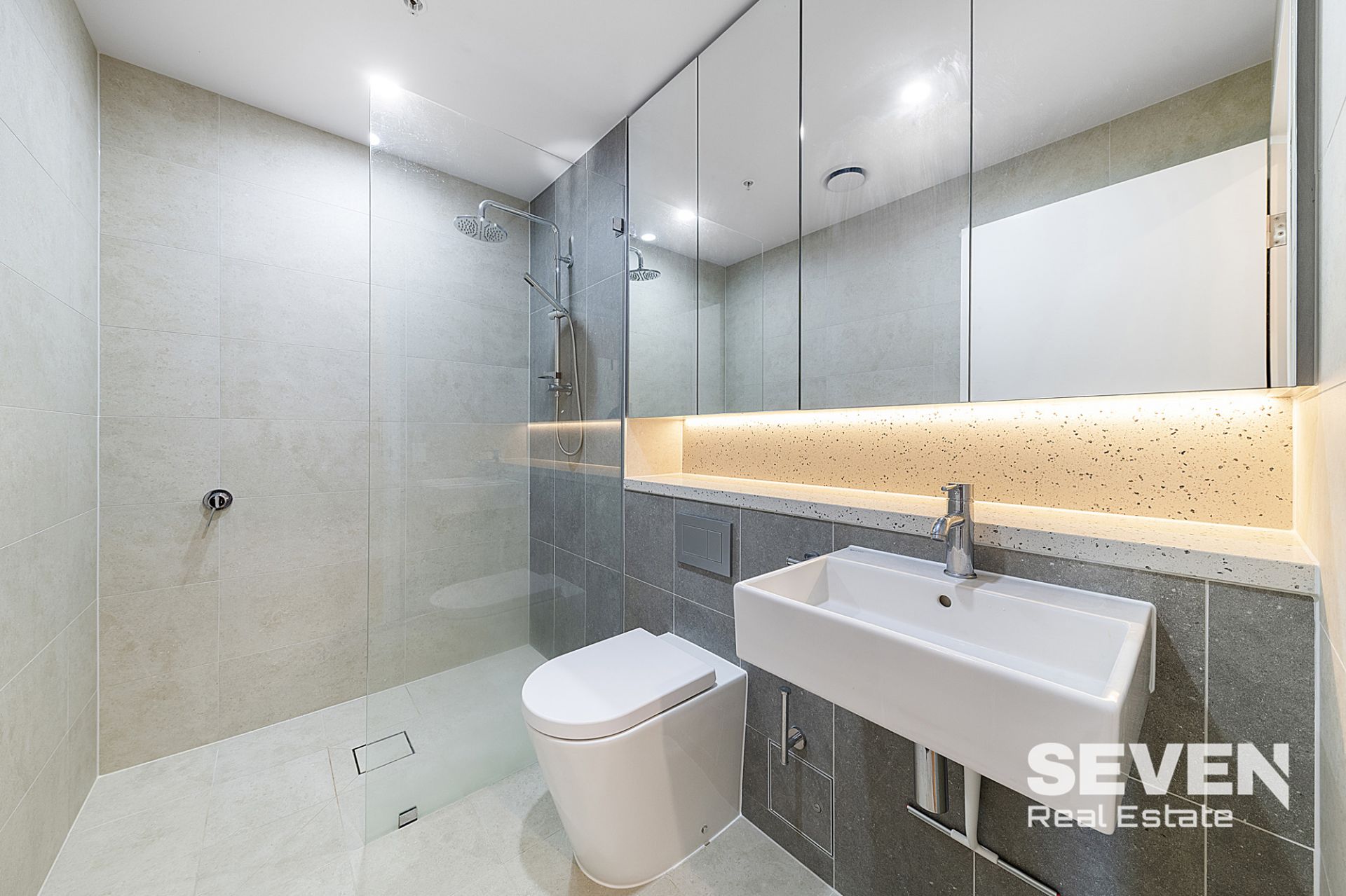 ✅ – Fully tiled bathroom including fixed frameless shower