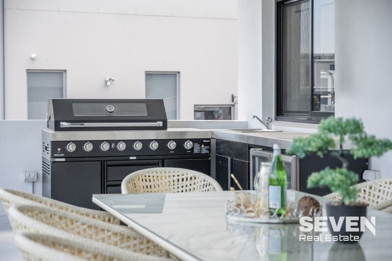 • 40mm Caesarstone benchtops with waterfall edges, a combination gas and induction cooktop caters to varied cooking styles.