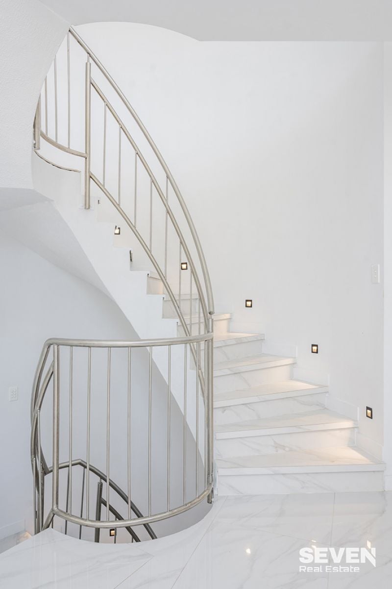 The arrival is immediately impressive, with soaring ceilings, feature lighting and a curved staircase creating a striking first impression. High-quality materials, thoughtful detailing and carefully planned illumination are carried throughout the home, enhanced by a full internal lift providing easy, step-free access to every level.